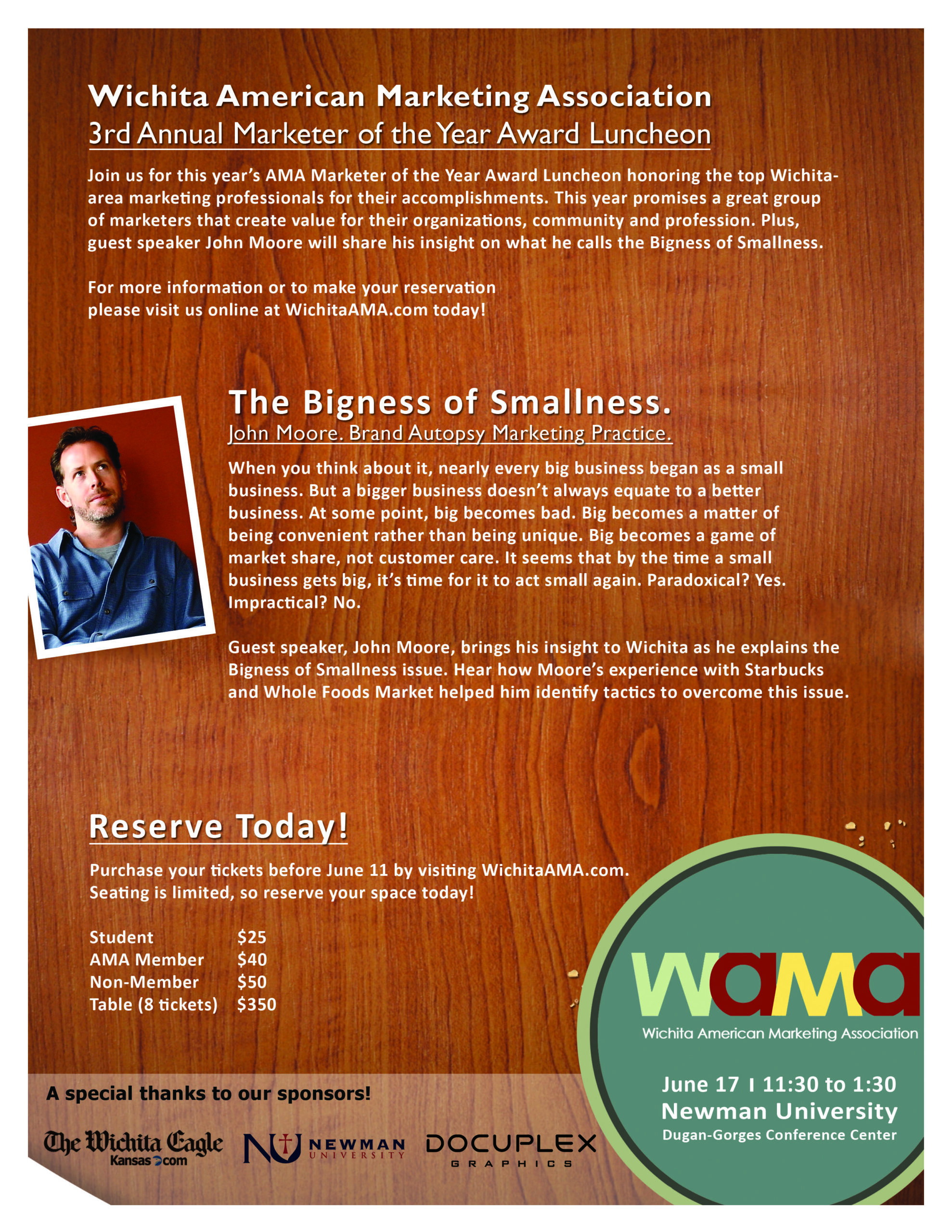 Full collateral suite for the Wichita AMA’s annual Marketer of the Year luncheon, including event flyer, program, signage, mailers, and ads. Designed and produced while serving on the WAMA board. The warm wood-toned layout was a deliberate departure from standard event materials, built to feel like an informal coffee shop chat rather than a stuffy association meeting.