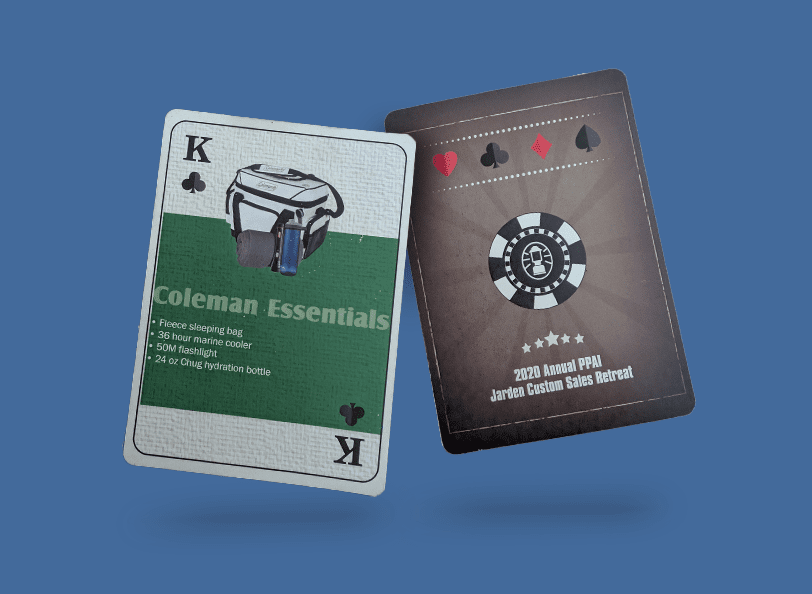Custom playing card set created for the Jardeen Annual Sales Retreat, showcasing Coleman Essentials product bundles. Concept, design, layout, and print production handled personally from brief to finished piece.